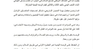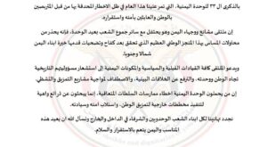 اليمن الحرالاخباري/ هنأ التحالف الوطني لصنع السلام في اليمن، أبناء الشعب اليمني بالعيد الثالث والثلاثين لقيام الوحدة اليمنية المباركة. وقال التحالف في بيان صادر عنه بالمناسبة اننا ونحن نحتفل بهذا المنجز التاريخي، نتذكر تضحيات المناضلين الاوائل الذين قدموا ارواحهم فداء في سبيل تحقيق لحمة اليمنيين واستعادة وحدتهم التي مزقها الاستعمار …
