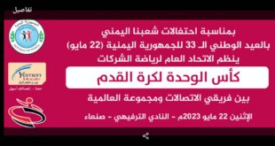اليمن الحرالاخباري/ ينظم الاتحاد العام لرياضة الشركات غدا الاثنين مباراة في كرة القدم على كأس الوحدة اليمنية بين فريقي الاتصالات والعالمية برعاية يمن موبايل . وأوضح رئيس الاتحاد العام لرياضة الشركات قاسم الوادعي ان هذه المباراة على كأس الوحدة اليمنية تأتي تدشينا لأنشطة وبرامج الاتحاد للعام الجاري ٢٠٢٣م . …