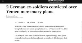 اليمن الحر الاخباري/ متابعات أدانت محكمة ألمانية، اليوم الاثنين، جنديين ألمانيين سابقين بمحاولة تشكيل مجموعة مرتزقة للمشاركة في الحرب على اليمن. وبحسب ما نقلته صحيفة “واشنطن بوست”، قضت محكمة ولاية شتوتجارت على الجنديين، لم تذكر اسميهما، 61 و 53 عاما، بالسجن 18 شهرا و 14 شهرا مع وقف التنفيذ. وخلصت …